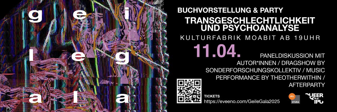 Die studentische Hochschulinitiative QueerIPU lädt gemeinsam mit den Herausgeber*innen des aus der IPU hervorgegangenen Sammelbandes „Transgeschlechtlichkeit und Psychoanalyse“ (2024) zur Geilen Gala ein. Im Mittelpunkt der Veranstaltung steht die Auseinandersetzung mit dem Verhältnis von Gendervarianz und Psychoanalyse sowie die Diskussion über theoretische Ressourcen, die genutzt werden können, um vorherrschenden Pathologisierungen entgegenzuwirken.