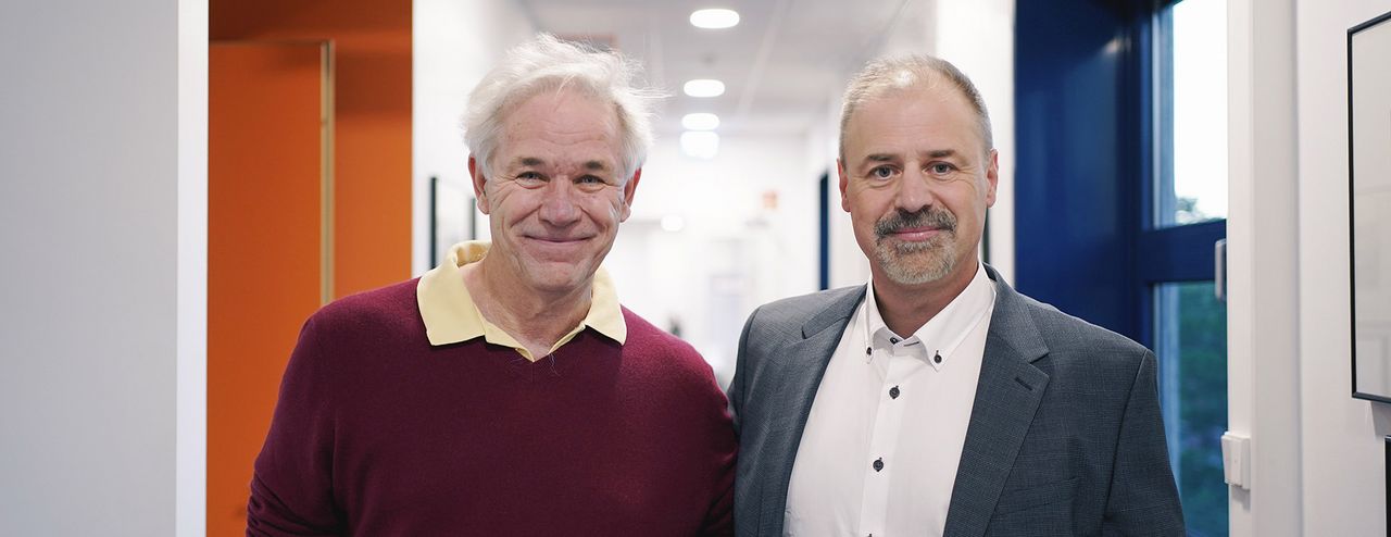 Mark Solms (links) und Roger Frie kurz vor der feierlichen Eröffnung des Wintersemesters 2021/2022 an der IPU Berlin.