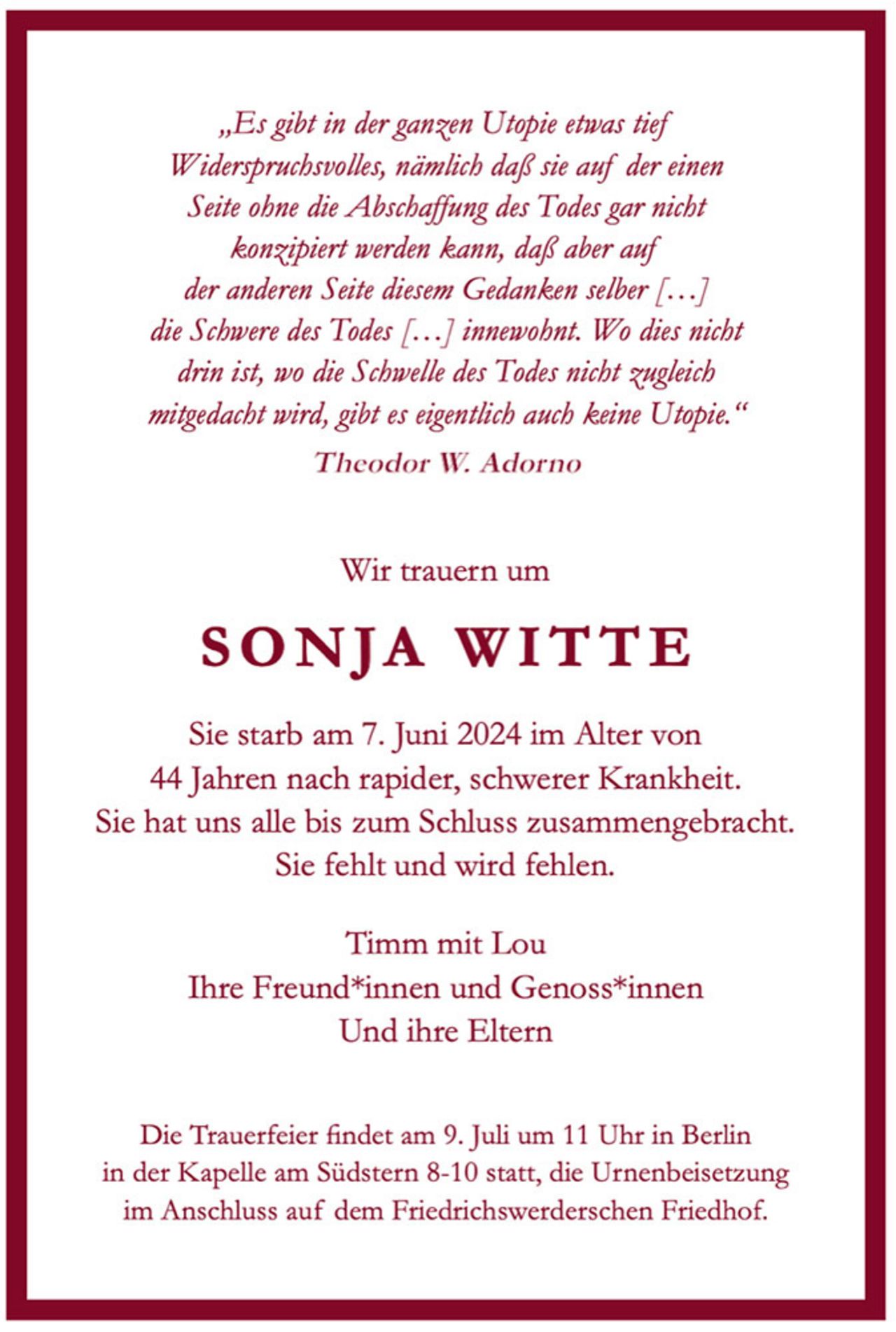 Sonja Witte ist im Alter von 44 Jahren nach kurzer, schwerer Krankheit gestorben. Als aufstrebende Wissenschaftlerin, werdende Psychotherapeutin, Partnerin und Mutter stand sie mitten im Leben und wusste dieses Leben zu genießen. Ihren Kolleginnen und Kollegen, ihren Freundinnen und Freunden und ihrer Familie wird sie schmerzlich fehlen.